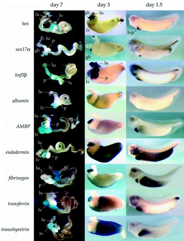 Fig. 2. Embryonic expression of liver markers by in situ hybridization. Each indicated probe was tested on three stages: day 7 (stage 46/47) gut tubes in the left column, day 3 (stage 41/42) gut tubes in the centre column and whole tail bud embryos (stages 30â35) in the right column. Light blue 5-bromo-4-chloro-3-indolyl-phosphate colour reactions were used to visualize the specific expression in the day 7 gut tubes. The pancreas tissue is bright white in these preparations. Brown, blue or black colour substrates indicate the specific staining in day 3 gut tubes. All preparations are shown with anterior to the left. lv, liver bud; p, pancreatic bud; gb, gall bladder bud; lu, lung bud. |