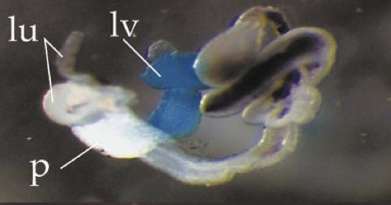 alb (albumin) gene expression in Xenopus laevis embryo, visualised via light blue 5-bromo-4-chloro-3- indolyl-phosphate color reactions, in NF stage 46/47 isolated gut tubes, anterior left. |