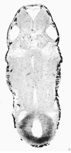 Fig. 3. Expression of markers in the liver diverticulum endoderm. (A) Schematic of a tail bud embryo (stage 33) with the line indicating the plane of section through the liver diverticulum (left). The right side shows a typical resulting section with the endoderm indicated in grey. ot, otic vesicle; nt, neural tube; endo, endoderm; ecto, ectoderm; meso, mesoderm; lvd, liver diverticulum. (B) Representative vibritome sections (as illustrated above) of whole-mount embryos hybridized with the indicated probes. Sections from the hex, hnf3β, AMBP, endodermin, fibrinogen and transferrin stained embryos are through the anterior portion of the liver diverticulum at the level of the otic vesicle. Sox17α and transthyretin sections are from the posterior end of the liver diverticulum. All of the markers are expressed in the endodermal layer and excluded from the mesoderm. Note that the dark colour of the outer ectoderm is pigment and not staining. |