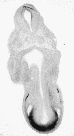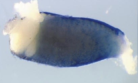 tf (transferrin) gene expression in Xenopus laevis embryo, visualised via light blue 5-bromo-4-chloro-3- indolyl-phosphate color reactions, in NF stage 46/47 isolated gut tubes, anterior left. |
