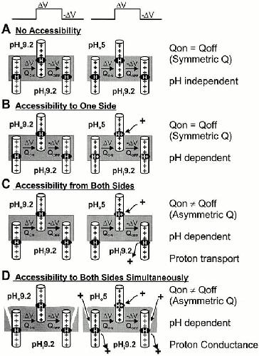 Figure 2. Histidine scanning mutagenesis. The various experimental outcomes of histidine scanning mutagenesis (summarized in text on the right) depend on the accessibility of the histidine (H, unprotonated; H+, protonated) to solution protons during gating. Histidine accessibility during gating is monitored as pH-dependent changes in the gating charge displacement (Q) evoked by membrane potential pulses (shown at top). A depolarizing pulse (ΔV) moves the positively charged voltage sensor (represented as a cylinder) from the inside of the membrane (gray box) towards the outside, thereby displacing gating charge Qon. Repolarization (−ΔV) returns the gating charge Qoff. If the histidine is part of the voltage sensor, modulation of Qon by the internal pH (pHi) indicates internal exposure and modulation of Qoff by the external pH (pHo) indicates external exposure. The relationship between Qon and Qoff is shown schematically in pHo/pHi 9.2/9.2 (left) and in pHo/pHi 5/9.2 (right) for four different histidine exposure possibilities. |