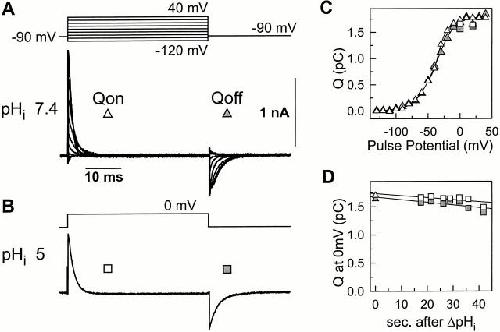 Figure 3. Gating charge displacement in the R377H channel is unaffected by internal protons. (A) Gating current records from the R377H channel measured from an inside-out macropatch in symmetric NMDG-MS pH 7.4 solutions. The superimposed currents are in response to various test pulses from a holding potential of −90 mV, also shown superimposed at the top. Onset of the test pulse stimulates an ON-gating current (Qon), and repolarization of the membrane causes the returning OFF-gating current (Qoff). (B) The same sequence of superimposed gating current records from the same macropatch after exchange of the pH 7.4 internal solution (pHi 7.4) with a pHi 5 internal solution. (C) ON- and OFF- gating currents were each integrated over time and plotted as a function of pulse potential to obtain the voltage dependence of steady-state charge displacement (Q-V curves). Q-V curves are shown for the ON- (left panel, open symbols) and OFF-gating currents (right panel, closed symbols) displayed in A (pHi 7.4, triangles) and B (pHi 5, squares). The ON and OFF Q-V curves for the gating currents measured in symmetric pH 7.4 solutions are plotted on the same graph in the inset of the right panel. Each Q-V curve was fit to a sum of two Boltzmann distributions (lines). (Experiment D03238a) |