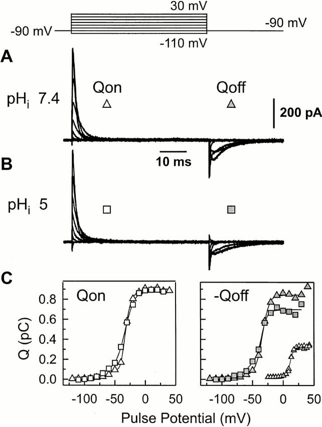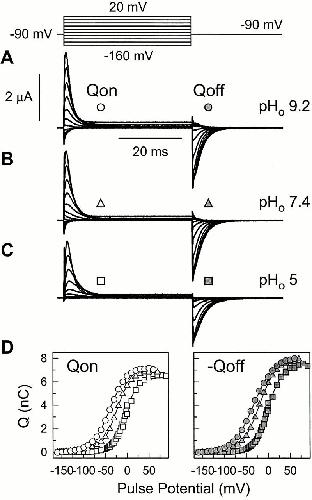 Figure 12. Gating currents of the E283Q/R371H channel. (A) Using the cut-open oocyte voltage clamp, E283Q/R371H channel gating currents were measured in symmetric NMDG-MS solutions with internal pH 9.2, and either pHo 9.2 (top currents) or pHo 5 (bottom currents). All gating currents were recorded from the same membrane area. The gating currents in each pHo group (shown superimposed) were elicited by the pulse protocol series shown at the top. (B) Q-V curves for the ON- (open symbols) and OFF-gating currents (closed symbols) displayed in A (pHo 9.2, circles; pHo 5, squares). (C) The voltage dependence of steady-state ON-gating currents shown in A (circles, pHo 9.2; squares, pHo 5). The linear leak component has already been subtracted out, as described in materials and methods (Data Analysis of I-V Curves). (Experiment D11037a) |