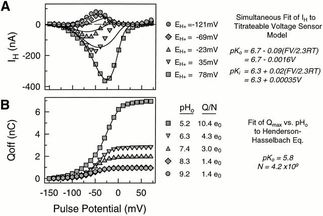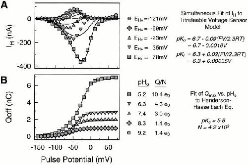 Figure 9. Voltage dependence of proton transport and gating charge displacement in the R368H channel. A family of pulse-evoked R368H channel gating currents and pHi were simultaneously measured in five different pH gradients across the membrane, as described and shown for three of the gradients in Fig. 7. pH gradients were established using HB recording solutions by leaving the internal solution constant and varying pHo: pHo/pHi 5.2/6.6 (âª), pHo/pHi 6.3/6.9 (â¾), pHo/pHi 7.4/7.0 (â´), pHo/pHi 8.3/7.1 (â¦), and pHo/pHi 9.2/7.1 (â¢). (A) Voltage dependence of steady-state proton current amplitudes in five pH gradients (proton transport I-V curves). The Nernst equilibrium potential established by each pH gradient, EH+, is also displayed. All five proton current I-V curves were simultaneously fit to an expression for proton current values predicted from a titrateable voltage sensor model (see theory, second term of ) with voltage-dependent pKas (). The best fit values for pKo and pKi are shown in two forms: first, pK(V) = pK(0) ± δ(FV/2.3RT) to highlight δ, the fraction of the electric field sensed, followed by pK(V) at room temperature to highlight the slope of the voltage dependence, where V is in units of millivolts. Other parameters of the fit are: N = 1.82e10, z = 3.09, z1= 0.061, δα1 = 0.012, δα2 = 0.376, α1(0) = 8464/s, α2(0) = 67215/s, and β1(0) = 4775/s. (B) Corresponding Q-V curves for the OFF-gating currents in five pH gradients. Total gating charge per channel (Q/N) was estimated by fitting Qmax versus pHo to the Henderson-Hasselbach equation (Q/N = Qmin + {(Qmax â Qmin)/[1 + exp[2.3(pHo â pKo)]]}). The fit predicted a pKo of 5.8 and saturated at a maximum value of 8.37 nC. Assuming that the fully protonated voltage sensor displaces 12.5 e0 per channel as the wild-type, N = 8.37 nC/12.5 e0 = 4.2e9. (Experiment D11200a) |