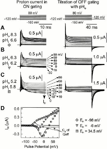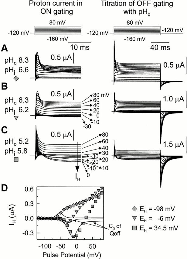 Figure 10. Gating currents of the R371H channel. Using the cut-open oocyte voltage clamp with a H+ sensitive electrode, R371H channel gating currents and pHi were simultaneously measured in three pH gradients: pHo/pHi 8.3/6.6 (A), pHo/pHi 6.3/6.2 (B), and pHo/pHi 5.2/5.8 (C). The gradients were established with HB recording solutions; the external solution was varied while the internal pH 5 solution was left unchanged. All gating currents were recorded from the same membrane area. The gating currents in each pHo/pHi group (shown superimposed in A–C) were elicited by the pulse protocol series shown at the top. The left panel of A–C is an enlargement of the ON-gating currents shown fully in the right panel. Linear leak current was subtracted from each current trace off-line as described in materials and methods (Data Analysis of I-V Curves). (D) Voltage dependence of steady-state proton current amplitudes (proton current I-V curves) measured in three pH gradients: pHo/pHi 8.3/6.6 (♦), pHo/pHi 6.3/6.2 (▾), and pHo/pHi 5.2/5.8 (▪). IH was determined by taking the isochronal, steady-state amplitudes of the ON-gating currents shown in A–C. The linear leak component has already been subtracted out as described in materials and methods. The Qoff-V curve associated with each I-V curve was used to generate the voltage dependence of the gating capacitance, Cg. Each Cg-V curve (lines) was scaled to its associated I-V curve. (Experiment D11210b) |