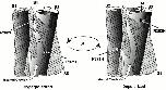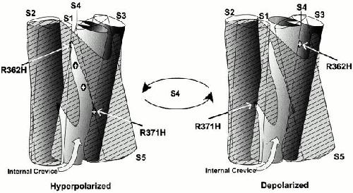 Figure 13. A model of voltage sensor operation. A model illustrating the movement of the Shaker K+ channel S4 segment from a hyperpolarized position (left) to a depolarized position (right). Only five transmembrane segments (S1–S5) of one subunit are shown for clarity. The hydrophobic region surrounding the internal crevice is represented as a hatched cloud shaped by the membrane and the sides of S1 and S5 facing each other. Depolarization causes a rotation of the S4 segment and movement of the first four S4 charges from the internal crevice to an externally facing crevice. The external crevice cannot be seen; it faces the back between the S2 and S3 segments. |