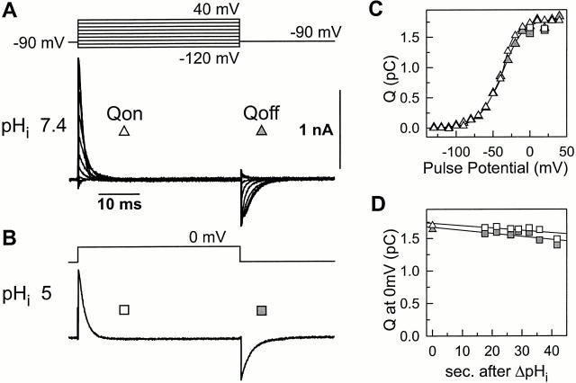 Figure 5. Gating charge displacement in the K374H channel is unaffected by internal protons. (A) Gating current records from the K374H channel measured from an excised inside-out macropatch in symmetric NMDG-MS solutions, pH 9.2 in the outside and pH 7.4 in the inside (pHi). The superimposed currents are in response to various test pulses from a holding potential of −90 mV, shown superimposed at the top. (B) Gating current in response to a 0 mV test pulse from the same macropatch during perfusion of pHi 5 internal solution. (C) Q-V curves for the ON- (open symbols) and OFF-gating currents (closed symbols) displayed in A (pHi 7.4, triangles). Each Q-V curve was fit to a sum of two Boltzmann distributions (lines). The internal side was perfused with pHi 5 solution, and test pulses to 0 mV were intermittently applied 20 s later to measure the saturating charge displacement. A test pulse to 20 mV was also applied once to confirm saturation of charge displacement. The average of the charge displaced in the ON- and OFF- gating currents from seven of these 0-mV test pulses and the 20 mV pulse during pHi 5 perfusion are shown (squares). (D) Qon (open symbols) and Qoff (closed symbols) in response to 0 mV test pulses measured in pHi 7.4 (triangles) and during internal pHi 5 perfusion (squares). The lines through the data are linear regressions. (Experiment D11077b) |