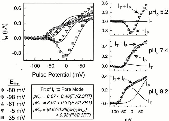 Figure 11. Proton transport and conduction by the R371H channel voltage sensor. I-V plots of the steady-state proton currents, IH, measured in five different pH gradients: pHo/pHi 9.2/7.8 (•), pHo/pHi 8.3/6.6 (♦), pHo/pHi 7.4/6.34 (▴), pHo/pHi 6.3/6.2 (▾), and pHo/pHi 5.2/5.8 (▪). The Nernst equilibrium potential established by each pH gradient, EH+, is also displayed. Gating currents and pHi were measured simultaneously as described and shown for three of the gradients in Fig. 10. All five proton current I-V curves were simultaneously fit to an expression for proton current values (see theory, ) predicted from a model of a titrateable voltage sensor that forms a proton pore upon depolarization. The proton current predicted by the model is the sum of a proton transport current, IT, and a proton pore current, IP. The parameters of the best fit to the model (shown as lines) are: pKo(0) = 6.67, pKi(0) = 8.07, δo = 0.460, δi = 0.373, δip = 0.934, γo = 93.5/s, ɛo(0) = 4.33e8/(M s), γip = 138/s, N = 3.08e10, z = 1.14, z1 = 0.844, δα1 = 0.139, δα2 = 0.879, α1(0) = 7247/s, α2(0) = 818/s, and β1(0) = 2,369/s. (Experiment D11210b) |