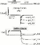 Figure 8. Titration of gating charge displacement in the R368H channel. The gating currents in response to a 50-mV test pulse, were recorded in three pH gradients from the same oocyte described in Fig. 7. The current records are shown here superimposed along with the corresponding gating charge displacement obtained by integrating the gating currents over the duration of the ON and OFF potential pulses. (Experiment D11200a) |