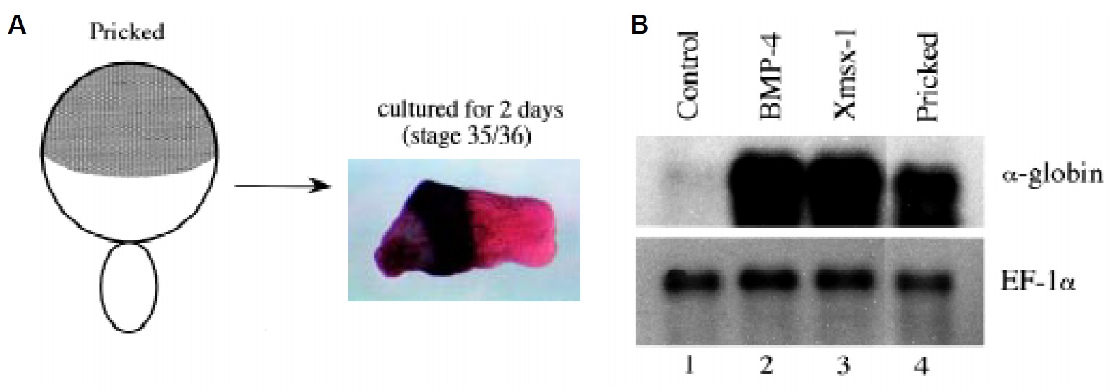 RNA (0.5 ng/embryo) and cultured for 2 days (stage 35/36). (B) Expression of a-globin in a pricked