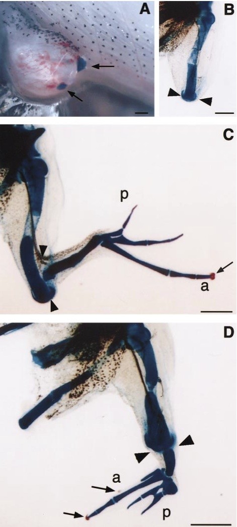 Fig. 2. Effect of FGF-10 application on Xenopus limb regeneration. (A) A beads-implanted stump of a stage 56 limb amputated at knee level. Two affi-gel blue beads (arrows) were implanted near anterior and posterior sides of the amputated plane at the distal edge of the femur. (B) A sample after amputation and PBS-soaked beads implantation. Nothing is regenerated. (C and D) Regenerates from FGF-10-applied stage 56 limbs. Note that only anterior digits have claws (arrows). a, anterior; p, posterior. All arrowheads indicate amputation level (knee level). Bars, 1 mm for (B); 250 um for (A).