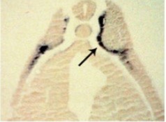 Fig. 1. Expression of three different forkhead genes during early Xenopus development. (A) In situ hybridization of XFKH1(FoxA4b) to a stage 12 Xenopus embryo (dorsal view). Expression is in the notochord (arrow). (B) In situ hybridization of XFKH7 to a stage 12 Xenopus embryo (dorsal view). Expression is in the presomitic mesoderm, and is absent in the notochord (arrow). (C) Transverse section of a stage 15 embryo hybridized with XFKH1(FoxA4b). Expression is in the notochord and neural floor plate. (D) Expression of XFKH7 in the trunk section of the stage 14 embryo. Expression is in the presomitic mesoderm, but it is absent in the notochord and the neural floor plate. (E) Expression of the XFD-13FoxF1b) in the trunk section of stage 15 embryo. Expression is in the lateral plate mesoderm. No expression is visible in the notochord and presomitic mesoderm. Expression is also absent in the most ventralmesoderm.