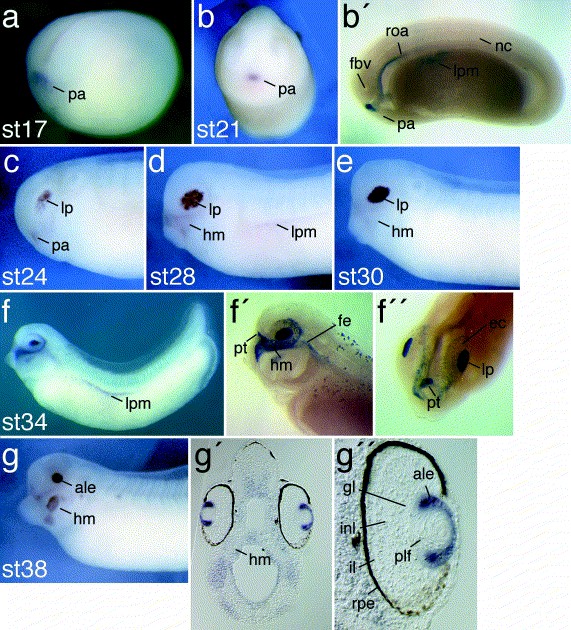 Fig. 2. Expression of Xpitx3 during Xenopus development. Whole-mount in situ hybridization was performed using Xpitx3 antisense RNA and staged Xenopus embryos. NieuwkoopâFaber stages of embryogenesis are indicated. (a,bâ²,c,d,e,f,fâ²,g) Lateral view; (b) anterior view of the embryo; to improve resolution cleared embryos in lateral view are shown in (bâ²,fâ²,fâ²). (gâ²,gâ²) show frontal sections of the embryo shown in (g). In (fâ²) the embryo of (f) is shown in an anterior view. ale, anterior lens epithel; fbv, forebrain ventricle; ec, eye cup; fe, foregut endoderm; gl, ganglion layer; hm, head mesenchyme; il, inner layer; inl, inner nuclear layer; lp, lens placode; lpm, lateral plate mesoderm; lv, lens vesicle; nc, notochord; pa, pituitary Anlage; pt, pituitary; rpe, retinal pigment epithel; pfl, primary lens fibres; roa, roof of archenteron. |