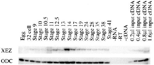 Fig. 2. Temporal expression profile of XEZ. RT-PCR showing expression pattern of XEZ transcripts in Xenopus laevis unfertilised egg and embryo stages. Significant maternal expression is not detected. Zygotic expression of XEZ commences at low levels in the late blastula stages, increasing at mid to late gastrula stages, peaking in the early neurula stages and is still detectable at stage 41. Stage 41 cDNA is used for the linearity control and ODC is used as a loading control.
