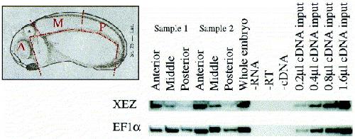Fig. 4. XEZ expression is anteriorly restricted. Dissection series of stage 25 Xenopus laevis embryos analysed by RT-PCR. Stage 25 embryos were dissected as shown in the insert picture into three equivalent axial pieces, A, anterior; M, middle; P, posterior; the endoderm was removed. Duplicate samples 1 and 2 both consisted of 5 embryos. Analysis shows the expression of XEZ is highest in the anterior nervous system, is reduced in the middle section and is barely detectable in the posterior in both dissected embryo pools. Whole embryo control cDNA at stage 25 was used for the linearity and EF1α was used as a loading control. Since the sections of neural tissue were equal in terms of regional identity, but only approximately equivalent in terms of amount of biological material, it is not reasonable to equalize loading of cDNA between samples (as shown by the EF1α signal).
