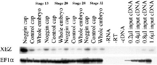 Fig. 5. XEZ is induced by noggin. RT-PCR showing induction of XEZ in noggin-injected animal caps. Animal caps were taken from stage 9 embryos previously injected at the 1 cell stage with noggin mRNA. The animal caps were cultured to stage 13, 20, 28 and 32. RT-PCR analysis shows that at stage 13 XEZ expression is highly induced in noggin animal caps compared to a much lower level of expression in control animal caps. However, this high level of expression is not maintained and XEZ expression is only slightly higher in animal caps overexpressing noggin compared to control caps at stages 20, 28 and 32. Stage 32 whole embryo cDNA was used as input for the linearity and EF1α was used as a loading control.