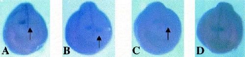 Fig. 3. Wholemount in situ hybridisation of XEZ. Wholemount in situ hybridisation of XEZ DIG labelled antisense RNA probe shows that expression of XEZ is restricted to the anterior nervous system. (A) Stage 14 embryo expression is restricted to the anterior nervous system (indicated by arrow) (B) Stage 20 embryo and (C) Stage 27 embryo, the XEZ transcripts are detected in the anterior nervous system. In (B) and (C) the expression pattern appears to be graded with the strongest expression in the most anterior regions. (D) Stage 35 embryo shows that expression of XEZ later becomes restricted to the forebrain, eye and branchial arches. The XEZ expression is highest in the first branchial arch, less in the second and is greatly reduced in the third and fourth arches. The sense probe control showed no staining pattern (data not shown).