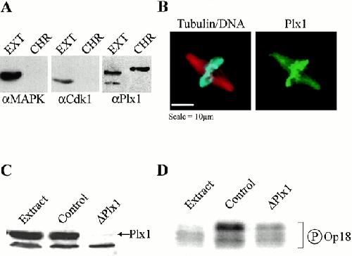 Figure 5. Plx1 is a chromatin-associated kinase and its depletion inhibits chromatin-induced Op18 hyperphosphorylation. (A) Immunoblot analysis of total extract (EXT) and proteins eluted from mitotic chromatin beads using 0.5 M KCl (CHR) probed with antibodies against MAP kinase, cdk1, and Plx1. (B) Immunofluorescence micrograph showing Plx1 localization to chromatin and microtubules in sperm spindles assembled in Xenopus egg extracts. Microtubules appear red, sperm chromosomes blue, and Plx1 green. (C) Immunoblot of total extract (Extract), IgG-depleted (Control), and Plx1-depleted (ΔPlx1) extracts shows that >99% of Plx1 has been removed. (D) Autoradiogram showing [γ32P]phosphate incorporation in Op18 immunoprecipitated from mitotic extract (Extract) or in IgG-depleted (Control) or Plx1-depleted (ΔPlx1) mitotic extract + chromatin beads.