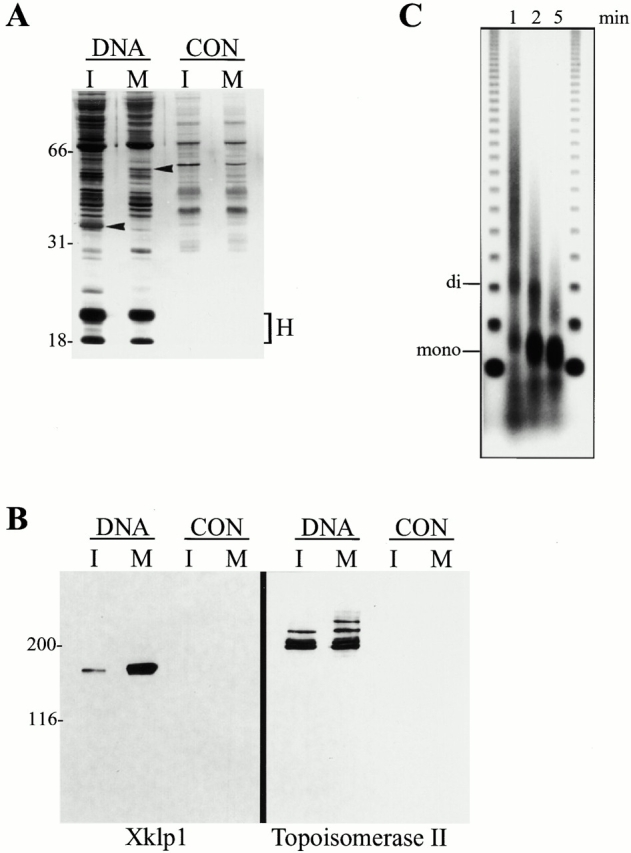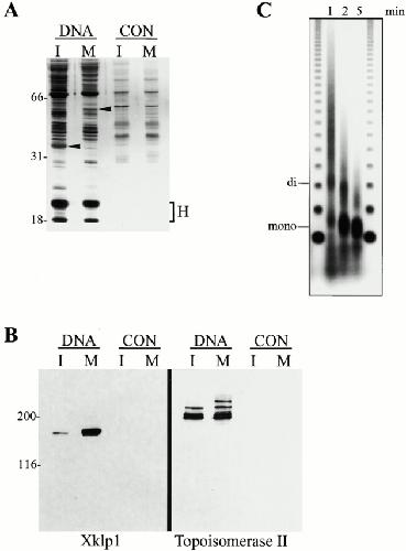 Figure 3. Chromatin assembles on DNA beads. (A) Silver stained gel of proteins associated with DNA beads and control beads in interphase (I) and mitotic (M) extracts. Arrowheads point to bands that are different between I and M. Histones (H) are indicated. (B) Western blot of the same samples from A probed with antibodies to Xklp1 and Topoisomerase II. (C) Micrococcal nuclease digestion of DNA beads for 1, 2, or 5 min; mononucleosomes (mono) and dinucleosomes (di) are indicated. Outer lanes are 123-bp markers.