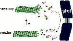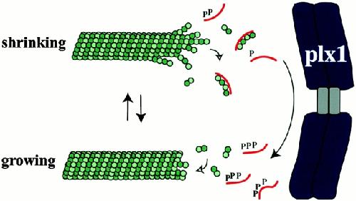 Figure 7. Model for Op18 regulation of microtubule dynamics in Xenopus. The curved line represents Op18 and P is a phosphate group. Unphosphorylated Op18 promotes microtubule depolymerization by sequestering tubulin. Op18 that encounters mitotic chromatin is phosphorylated by Plx1, preventing the Op18-tubulin interaction and promoting microtubule stabilization.
