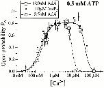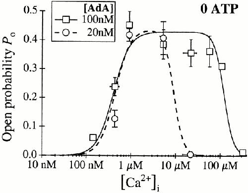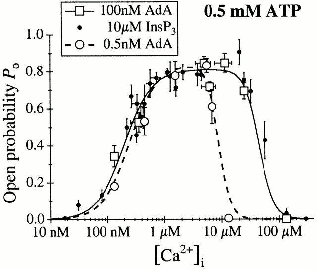 Figure 3. [Ca2+]i dependence of the Po of the X-InsP3R-1 channel in the presence of 0.5 mM ATP, activated by AdA or InsP3 (Mak and Foskett 1998). The solid and dashed curves are theoretical fits by the Hill equation () of the Po data from [AdA] = 100 nM and 0.5 nM, respectively.