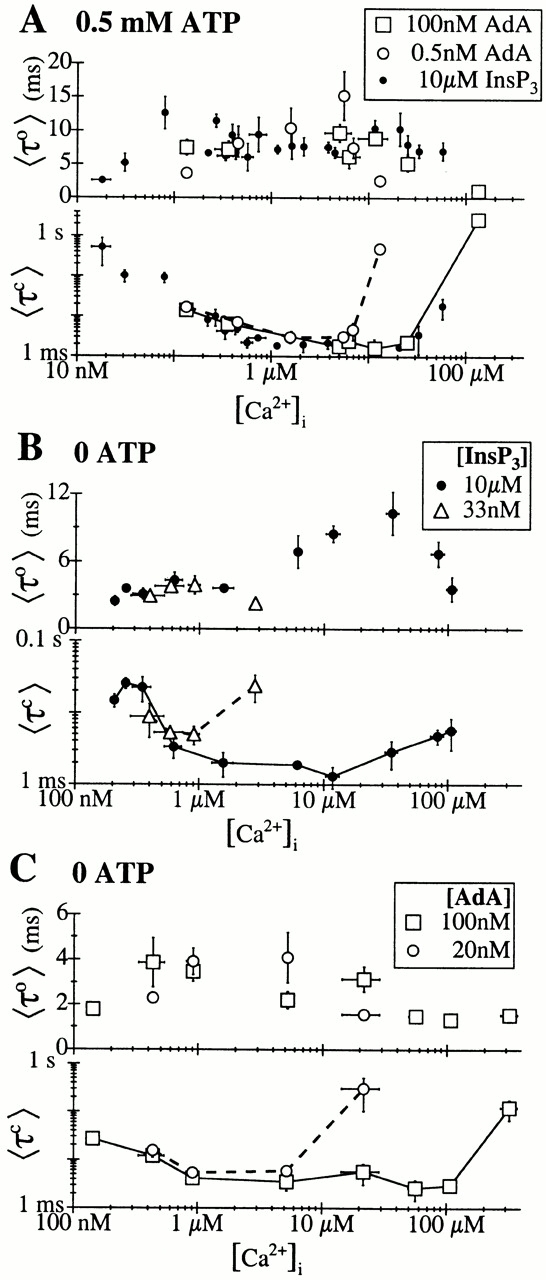 Figure 10. [Ca2+]i dependencies of the mean open (〈τo〉) and closed (〈τc〉) dwell times of the X-InsP3R-1 channel. In the 〈τc〉 graphs, data points from the same experimental conditions are connected with solid or dashed lines for clarity. (A) Channel activated by AdA or InsP3 (Mak and Foskett 1998), in 0.5 mM ATP. (B) Channel activated by saturating (10 μM) or subsaturating (33 nM) concentrations of InsP3 in the absence of ATP. (C) Channel activated by saturating (100 nM) or subsaturating (20 nM) concentrations of AdA in the absence of ATP.