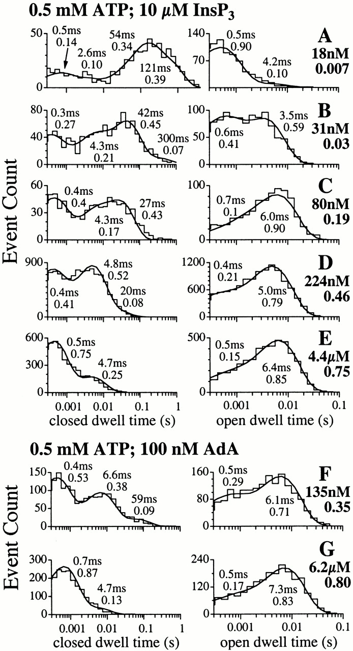 Figure 11. Open and closed dwell time histograms of the X-InsP3R-1 channel in 0.5 mM ATP and various [Ca2+]i, activated by saturating concentrations of InsP3 (10 μM) or AdA (100 nM). The smooth curves are the pdf. The time constant and relative weight of each exponential component of the pdf are tabulated next to the corresponding peak in the curves. [Ca2+]i used in each of the analyzed experiments and its Po are tabulated next to the corresponding graphs.