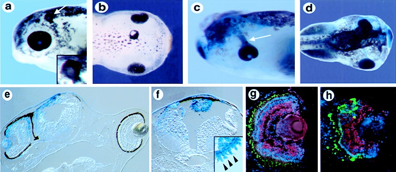 Overexpression of Xfz3 promotes ectopic eye formation and causes proximaleye defects. (a) Stage 42 embryo showing an ectopic eye in the dorsal head region (white arrow). (Inset) A higher magnification view of the ectopic eye. (b) Stage 45 embryo with an ectopic eye in the dorsal midline of the head. (c) Stage 42 embryo showing streaming of the retinal pigment epithelium from the endogenous eye toward the midline. (d) Stage 45 embryo with abnormally positioned eye on the injected side, marked with β-galactosidase (blue). (e) Section through an embryo similar to the one shown in d, showing the eye adjacent to the neural tube on the injected side (Left). (f) Section through a stage 45 embryo, showing an ectopic eye in the roof of the fourth ventricle that is fully labeled with the tracer β-galactosidase (blue). (Inset) A high-magnification view from an adjacent section, showing a row of morphologically distinct photoreceptor outer segments in the ectopic eye (arrowheads). (g and h) Immunolabeling of a section through a normal eye (g) and ectopic eye (h) with anti-Pax6 antibodies (red) and anti-rhodopsin antibodies (green). Nuclei are labeled with Hoechst (blue). The ectopic eye in h shows an arrangement of retinal layers similar to that in the normal eye in g.