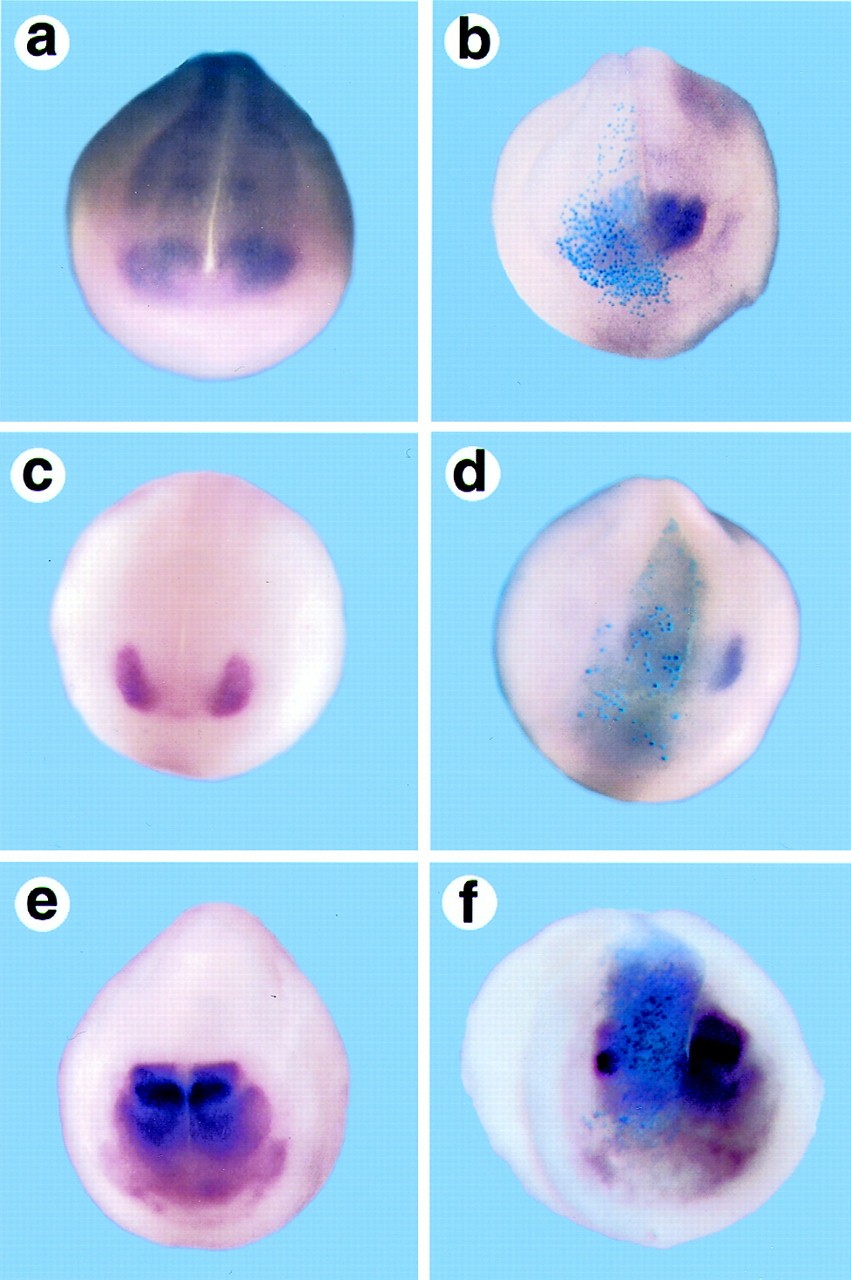 Overexpression of Nxfz3 suppresses expression of genes regulating eye development. A whole-mount in situ hybridization analysis was made of stage 180 embryos that are either uninjected (a, c, and e) or Nxfz3 injected (b, d, and f) and then labeled for Xpax6 (a and b), Xrx (c and d), or Xotx2 expression (e and f). β-Galactosidase (sky blue) marks the regions of the embryo derived from the injected blastomere.