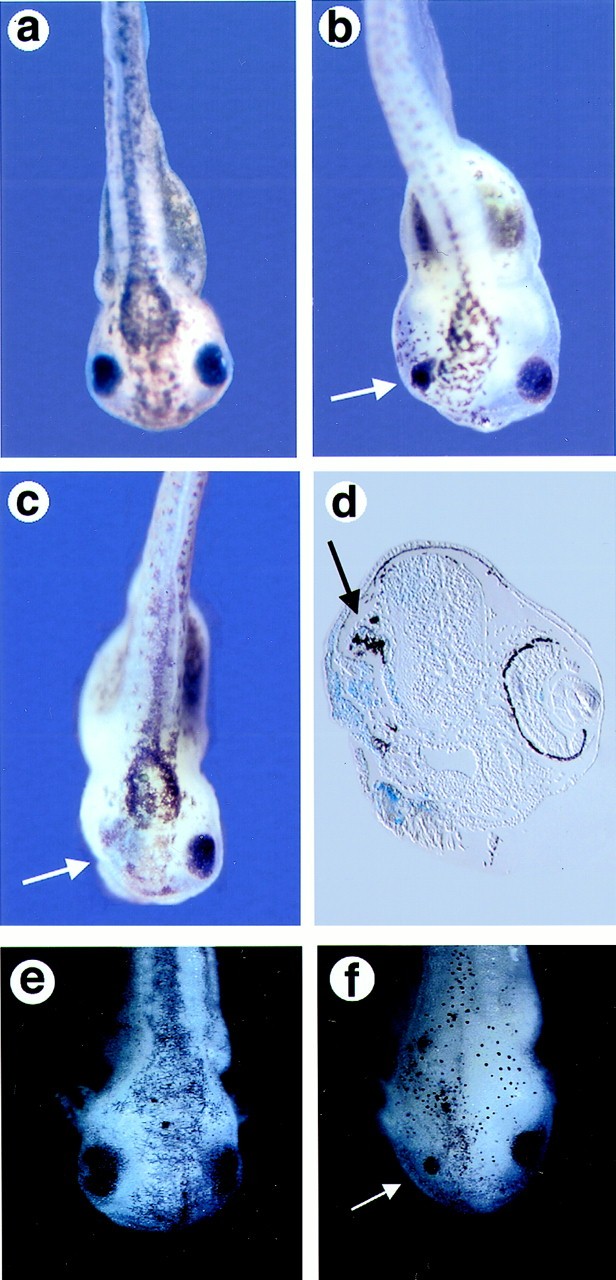 Overexpression of Nxfz3 or Kermit inhibits endogenous eye formation. (a) Uninjected embryo at stage 41. (b and c) Nxfz3-injected embryos at stage 41 showing a reduced (b) or absent eye (c) on the injected side (white arrow). (d) Section through an embryo with a missing eye, showing the loss of normal eye structure on the injected side with only residual disorganized pigment remaining (black arrow). The tissue derived from the injected blastomere is marked with β-galactosidase (sky blue). (e) Uninjected embryo at stage 43. (f) Kermit-injected embryo at stage 43 showing a reduced eye on the injected side (arrow).