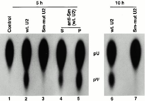 Figure 3. Binding of Sm proteins is required for U2 internal modification. [α32P]UTP uniformly labeled wild-type (lanes 2, 4, 5, and 6) or Sm-mutant U2 (lanes 3 and 7; see Fig. 1) was injected into isolated nuclei under oil. After 5 h (lanes 1â5) or 10 h (lanes 6 and 7) at room temperature, RNAs were recovered by phenol-chloroform-isoamylalcohol extraction and ethanol precipitation and subjected to the pseudouridylation assay (lanes 1â3, 6, and 7). For the wild-type U2, â¼40% (lane 2, 5 h) or 50% (lane 6, 10 h) of the expected level of modification was observed. Alternatively, wild-type U2 was recovered by anti-Sm (Y-12 antibody) immunoprecipitation after 5 h at room temperature and then subjected to the pseudouridylation assay (lanes 4 and 5). More than 85% of the expected level of modification was observed in immunoprecipitated RNA (lane 5). S, supernatant; P, pellet. The control is an uninjected U2 RNA. |