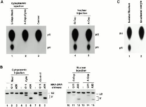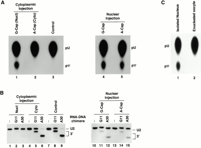 Figure 2. U2 internal modifications occur exclusively in the nucleus. α[32P]UTP uniformly labeled G- or A-capped U2 was injected into the cytoplasm of oocytes (A, lanes 1 and 2; B, lanes 1–6) or directly into nuclei (A, lanes 4 and 5; B, lanes 10–15). After cytoplasmic injection, only G-capped U2 entered the nucleus; after nuclear injection, both G- and A-capped U2 RNAs were retained in the nucleus. RNAs recovered from nuclei (A, lanes 1, 4, and 5; B, lanes 1–3, 10–15) or from cytoplasm (A, lane 2; B, lanes 4–6) were assayed for pseudouridylation (A) and 2′-O-methylation (B). In the 2′-O-methylation assay, two different chimeras were used to test two positions (G11 and A30). The control is uninjected U2 RNA. (C) Oocyte nuclei were separated from the cytoplasm under oil. α[32P]UTP uniformly labeled U2 was then injected into the isolated nuclei (lane 1) or enucleated oocytes (lane 2). After a 5-h incubation, U2 RNAs were recovered and assayed for pseudouridylation. The positions of uridylate, pseudouridylate, uncleaved U2, and 3′ fragments generated by RNase H site-specific cleavage are indicated on the side of each gel. In these experiments, >80% of the expected level of pseudouridylation and 2′-O-methylation was observed. |