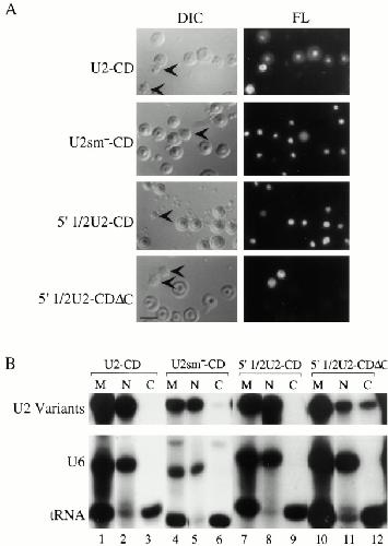 Figure 6. (A) Intranuclear localization of U2-C/D motif chimeras. 1 fmol of fluorescein-labeled wild-type U2-C/D motif chimera (U2+CD), Sm-mutant U2-C/D motif chimera (U2smâ-CD), 5â² 1/2U2-C/D motif chimera (5â² 1/2U2-CD), or 5â² 1/2U2-C/DÎC motif chimera (5â² 1/2U2+CDÎC) was injected into Xenopus oocyte nuclei, and nuclear spreads were prepared 5 h later. DIC and fluorescence (FL) panels are shown for each field. The arrowheads in the DIC panels indicate Cajal bodies. (B) Nucleocytoplasmic distribution of the U2-C/D motif chimeras. The distribution of the injected RNAs within the nuclear and cytoplasmic oocyte compartments was determined as described in the legend to Fig. 4 B. Bar, 10 μm. |