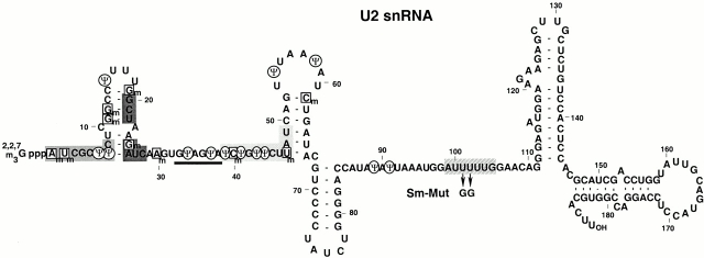 Figure 1. Primary and secondary structure of Xenopus U2 snRNA. Internal modified nucleotides are highlighted by circles (pseudouridines) and squares (2â²-O-methylated residues). The Sm binding site is indicated by a hatched gray box. Sequences known or predicted to be involved in intermolecular interactions are indicated: the thick line denotes bases interacting with the branch site of pre-mRNA; sequences boxed in dark gray, medium gray, and light gray are involved in U2-U6 interactions called Helix I, Helix II, and Helix III, respectively (Nilsen 1998). The arrows indicate mutations introduced into the Sm binding site (Sm-Mut). |