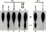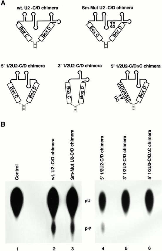 Figure 5. Introduction of a snoRNA nucleolar localization signal restores internal modification of Sm-mutant U2. (A) Structures of the wild-type U2-C/D motif chimera, the Sm-mutant U2-C/D motif chimera, the 5â² 1/2U2-C/D motif chimera, the 3â² 1/2U2-C/D motif chimera, and the 5â² 1/2U2-C/DÎC motif chimera, each containing a nucleolar localization signal derived from U14 snoRNA (box C, box D, and a short terminal stem), are shown schematically. The two arrows in the Sm-mutant U2-C/D chimera depict the double point mutation in the Sm binding site. The two arrows in 5â² 1/2U2-C/DÎC indicate the sequence alterations in box C. (B) [α32P]UTP uniformly labeled wild-type U2-C/D motif chimera (lane 2), Sm-mutant U2-C/D motif chimera (lane 3), 5â² 1/2U2-C/D motif chimera (lane 4), 3â² 1/2U2-C/D motif chimera (lane 5), or 5â² 1/2U2-C/DÎC motif chimera (lane 6) was injected into isolated nuclei under oil. 5 h later, RNAs were recovered and assayed for modification. 40â50% of the calculated level of modification was observed in lanes 2â4. The positions of uridylate and pseudouridylate are indicated. |