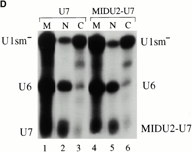 Figure 7. (A) Structures of Xenopus wild-type U7 snRNA and MIDU2-U7 chimera are shown schematically. The U7 Sm binding site is indicated by a hatched box. Thin lines represent the U7 RNA chain. In the MID U2-U7 chimera, the first 18 nucleotides of U7 are substituted with a Xenopus U2 sequence (nucleotides 19â46) indicated by a thicker line. (B) The U7 Sm binding site also supports U2 internal modification. [α32P]UTP uniformly labeled wild-type U7 (lane 1), U2-U7 chimera (MID U2-U7; lane 2), or wild-type U2 (lane 3) was injected into isolated nuclei under oil. 5 h later, RNAs were recovered and assayed for modification. The positions of uridylate and pseudouridylate are indicated. (C) Intranuclear localization of U7 and the U2-U7 chimera. 32P- and fluorescently labeled wild-type U7 and MID U2-U7 chimera were synthesized by in vitro transcription and 1 fmol of each RNA was microinjected into the nuclei of Xenopus oocytes. Nuclei were isolated 5 h later and nuclear spreads were prepared. Spreads were also prepared from uninjected oocytes as controls. DIC and fluorescence (FL) images are shown for each field. The arrowheads in the DIC panels point to Cajal bodies. Prominent Cajal body labeling was observed for both U7 and the MID U2-U7 chimera. Weak but above background nucleolar signal was also detected for the MID U2-U7 chimera. (D) The nucleocytoplasmic distribution of U7 and the U2-U7 chimera RNAs was determined as described in the legend to Fig. 4 B. Bar, 10 μm. |