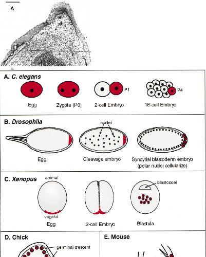 include pole plasm. (C) Xenopus germinal plasm is localized to the vegetal pole of the mature egg. It is partitioned equally between the first