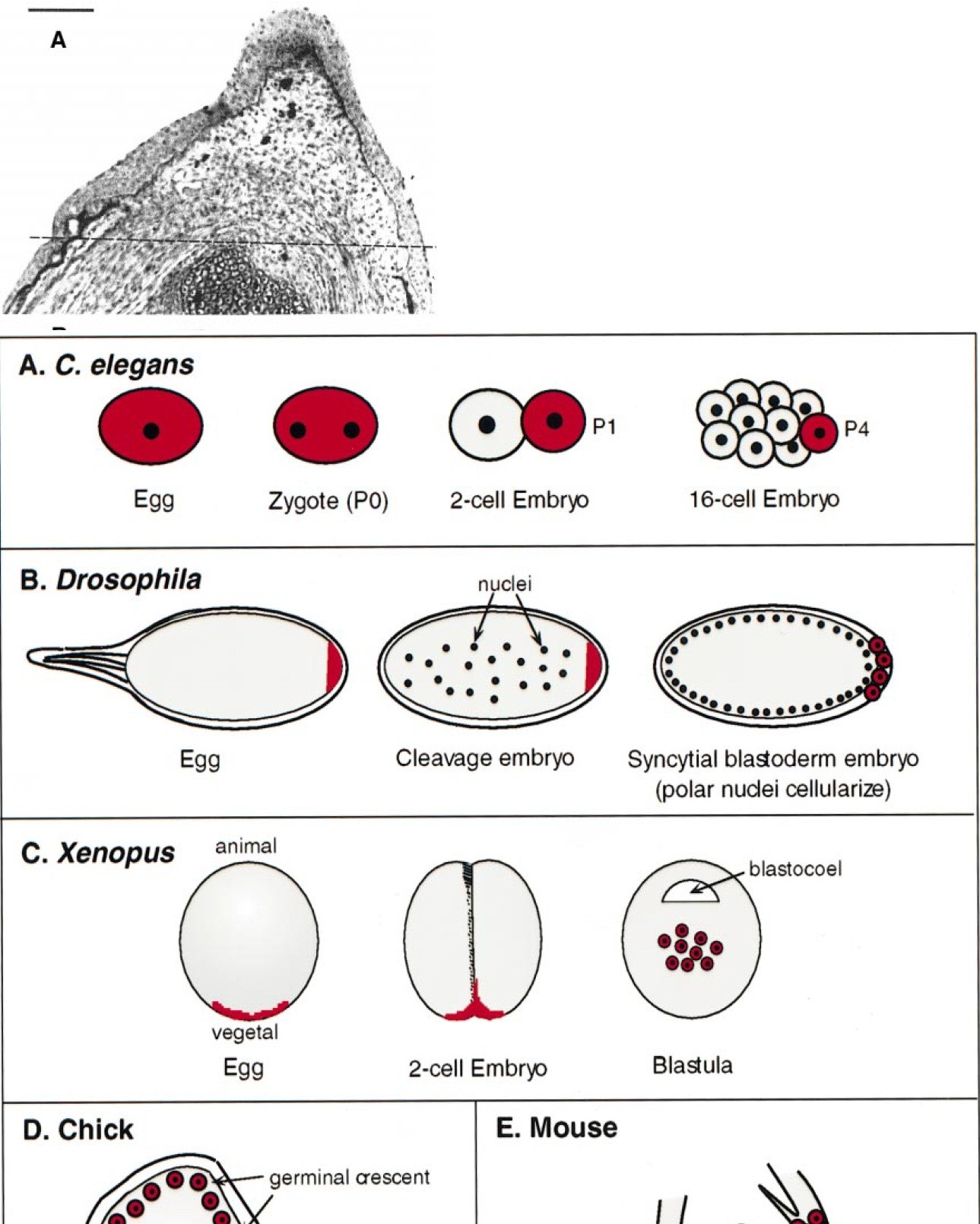 FIG. 1. Origin of PGCs. Germ plasm in A, B, and C is shown in red; PGCs in all panels are depicted in red as well. (A) C. elegans P granules