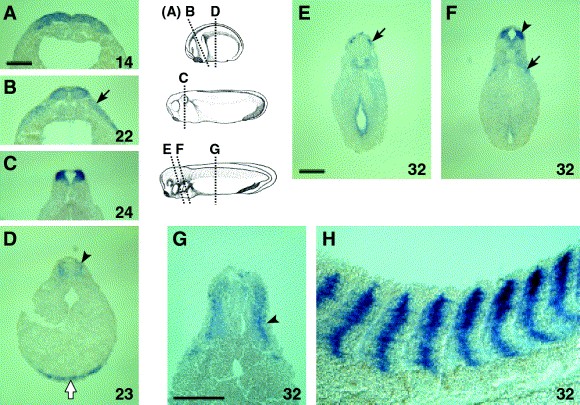 Fig. 3. Sections of embryos analyzed by whole-mount in situ hybridization for XmafB expression. (AâG) Sectioning planes are indicated in schematic diagrams. (A) At stage 14 XmafB is expressed in the anteriorneuroectoderm. (B) At stage 22, signal also appears in neural crest cells (arrow). (C) Stage 24. Staining is observed in the dorsal part of the neural tube. (D) Section of stage-23 embryo at the level of the trunk showing XmafB expression in somite (arrowhead) and blood island (white arrow). (EâH) Stage 32. (E) Section at the level of rhombomere (r) 4. Bilateral staining is seen in the dorsal part of the neural tube (arrow). (F) Section through r5 and pronephros. Expression of XmafB is found in the dorsal part of the neural tube (arrowhead) and developing pronephros (arrow). (G) Section at the level of the trunk showing XmafB expression in somite (arrowhead). (H) Parasagittal section shows myotomal cells are stained. Scale bars: 200 μm.
