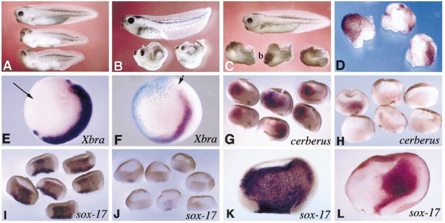 Xbra and do not contain the lineage label (arrow). (G) Bisected uninjected stage 11.5 embryos showing cerberus expression throughout the