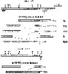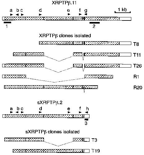 Fig. 1. Structure of the representative XRPTPβ clones and two cDNAs encoding the largest receptor (XRPTPβ.11) and phosphacan (sXRPTPβ.2). The gray boxes represent coding sequences and the open boxes, 5′- and 3′-noncoding sequences. The dotted lines indicate deletion of the DNA segments in between. The clones T8, T11 and T26, and R1 and R20 were isolated using D1/D2 probes (see Section 3.1) from the oligo (dT)-primed and random-primed cDNA libraries, respectively. The clones T3 and T19 were isolated using a fragment of R1 encoding the CAH/FN III sequence. Each clone partially encodes XRPTPβ.1 (R1), XRPTPβ.4 (T26), XRPTPβ.5 (T11), XRPTPβ.10 (R20), XRPTPβ.11 (T8), sXRPTPβ.1 (T3) and sXRPTPβ.2 (T19), respectively (see Table 1). The thick bars 1–3 indicate the sequences used as probes for Northern blot analysis (see Fig. 3), and the arrowheads a–h, positions of the oligonucleotide primers (see Section 2.2).