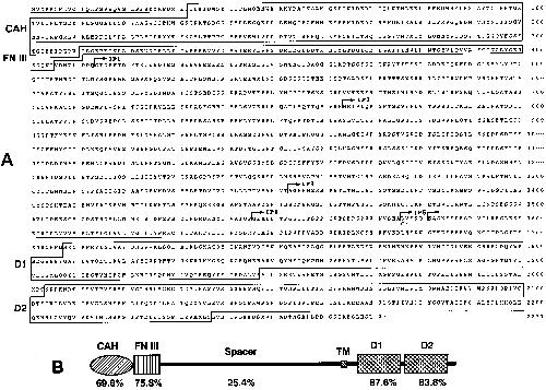 Fig. 2. (A) The aa sequences of XRPPβ.11 and sXRPTPβ.2. The hydrophobic signal peptide (aa 1–24) and the transmembrane peptide (aa 1602–1627) are underlined. The CAH domain (aa 33–301), the FN III domain (aa 311–404), and the two phosphatase domains, D1 and D2 (aa 1708–1948 and aa 2004–2237, respectively) are boxed. Arrows represent the boundaries of IP 1–IP 5. In sXRPTPβ.2, a single glycine (G) is substituted for the sequence following to the residue 1575, which results in deletion of the transmembrane and intracytoplasmic sequences. The complete nt sequences of XRPPβ.11 and sXRPTPβ.2 have been deposited in the DDBJ/GeneBank/EMBLE database (accession No. AB045237 and AB045238). (B) Comparison of the aa sequences of XRPTPβ.11 and human RPTPβ. Percentage of identical aa residues is shown for each domain.