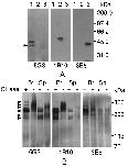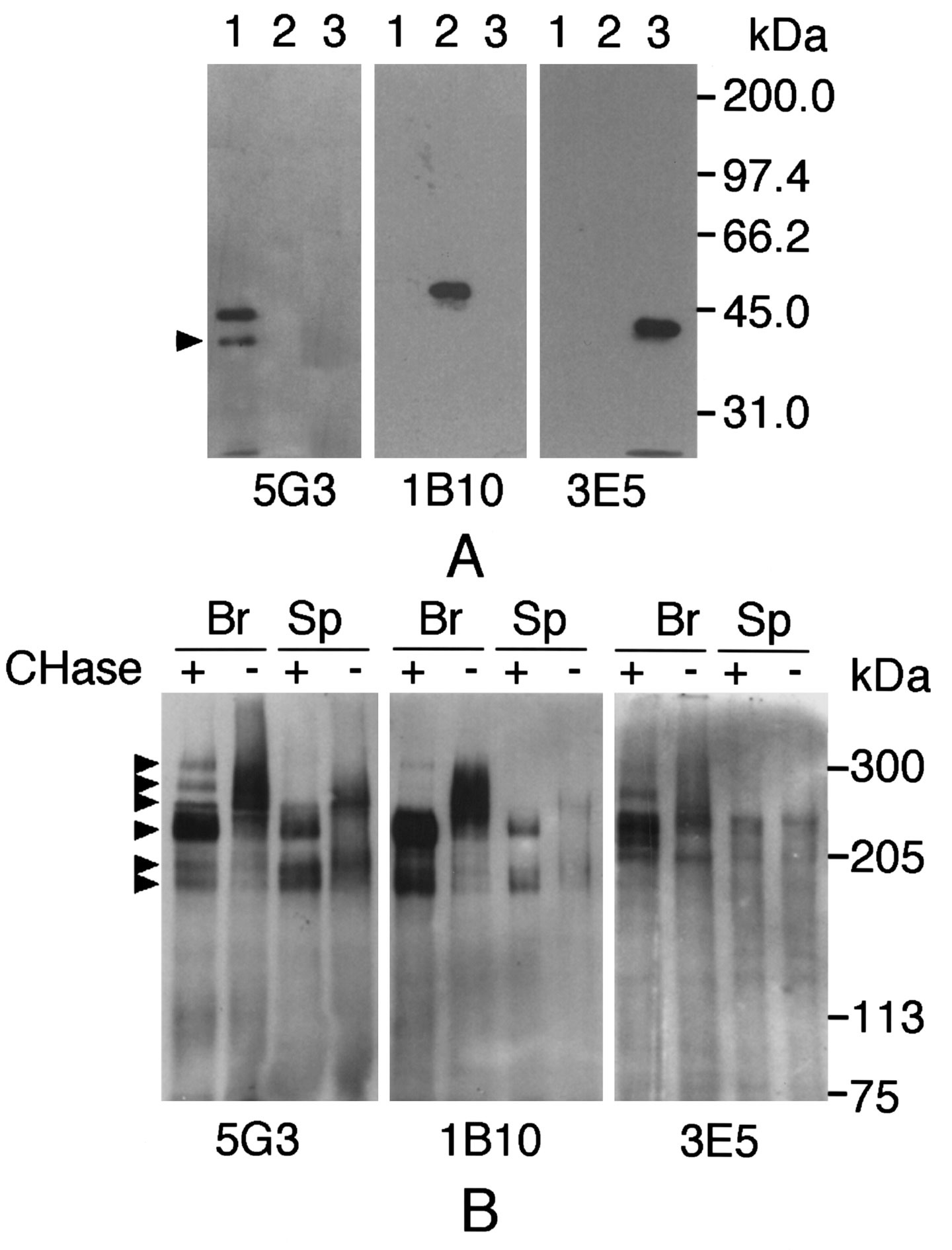 Fig. 5. Western blot analysis of XRPTPβ peptides and proteins. (A) Specificity of mAbs to XRPTPβ peptides. The lysates of bacteria producing recombinant CAH/FN III (lane 1), IP 1/IP 2 (lane 2) and D2 (lane 3) peptides were separated on a 10% acrylamide gel containing SDS, and transferred to a PVDF membrane. The blot was detected using mAbs 5G3, 1B10 or 3E5, which are prepared to recombinant CAH/FN III, IP 1/IP 2 and the D2 peptides, respectively (see Section 2.3). The lower band detected by 5G3 mAb (arrowhead on the left) may be due to degradation of the peptide in the upper band. (B) Detection of XRPTPβ proteins in the brain and the spinal cord. Extracts from adult brains (Br) and spinal cords (Sp) were incubated with (+) or without (−) chondroitinase ABC (CHase), and separated on a 6% acrylamide gel (see Section 2.4). XRPTPβ proteins on the blot were detected by the mAbs 5G3, 1B10 or 3E5. The arrowheads on the left show protein bands resolved in the chondroitinase-treated samples.