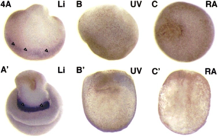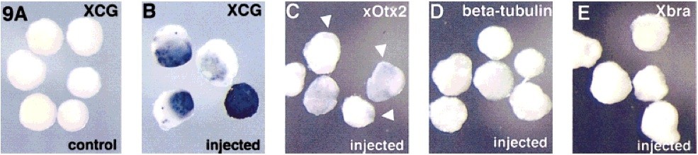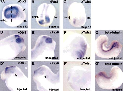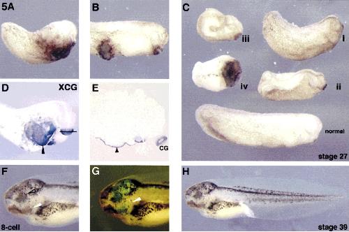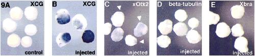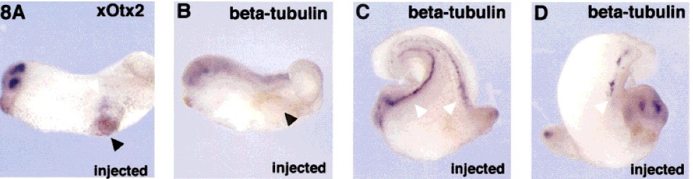 Xenopus Pitx1 is a homeobox gene whose family members are structurally and functionally conserved in organisms as diverse as Drosophila, chick, mouse, human, and frog. Present as a maternal transcript, the gene is zygotically expressed during gastrulation in a dorsal streak of cells. This streak restricts to a small circular domain underlying the center of presumptive neural plate. Shortly thereafter, a crescent of expression develops at the border of anterior neural ectoderm, and as the central plate domain diminishes, the crescent coalesces to define the presumptive cement gland. Expression remains high throughout cement gland development, and subsequently expands to include ectodermal cells involved in stomodeal invagination. During early organogenesis, expression ensues in developing eye, posterior lateral mesoderm, and first branchial arch derivatives. Ectopic expression of xPitx1 causes head deformities including enlarged cement gland, ectopic cement glands, and posterior deformities or, in extreme cases, inhibition of recognizable structures posterior to the cement gland. Expression of markers such as XCG-1, xOtx2, xPax6, neuralbeta tubulin, and xTwist suggest that increases in cement gland and lower mandibular size are likely at the expense of other head tissues. Paradoxically, overexpression is sufficient to partially rescue embryos that are axially perturbed by ultraviolet irradiation or retinoic acid administration. Ectopic expression of xPitx1 in ectodermal explants directly promotes cement gland development as there was no evidence that mesodermal or neural tissue was present in explants.