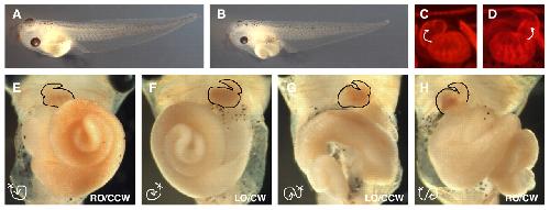 Fig. 5. XCR2 MO disturbs randomization of left-right asymmetric patterning of the heart and gut in stage 45-46 embryos. (A) Embryo injected with 50 ng of a standard control MO (SC MO). (B) Embryo injected with 50 ng of XCR2 MO. (C-H) Embryos injected with MO into the marginal region of both blastomeres at the two-cell stage, immunostained with MF 20 antibody, and the signal detected by fluorescence (C,D) or DAB staining (E-H). (C,E) Embryo injected with 50 ng of SC MO, showing normal left-right asymmetric patterning of the heart (C,E) and gut (right origin and counterclockwise coil, RO/CCW) (E). (D,F-H) Embryos injected with 20 ng of XCR2 MO. (D) Reversed morphology of heart. (F) Embryo has a mirror-imaged heart and gut (the left origin and clockwise coil, LO/CW). (G) Embryo has a normal heart, and left origin and counterclockwise-coiled gut (LO/CCW). (H) Embryo has reversed heart, right origin and clockwise-coiled gut (RO/CW). |