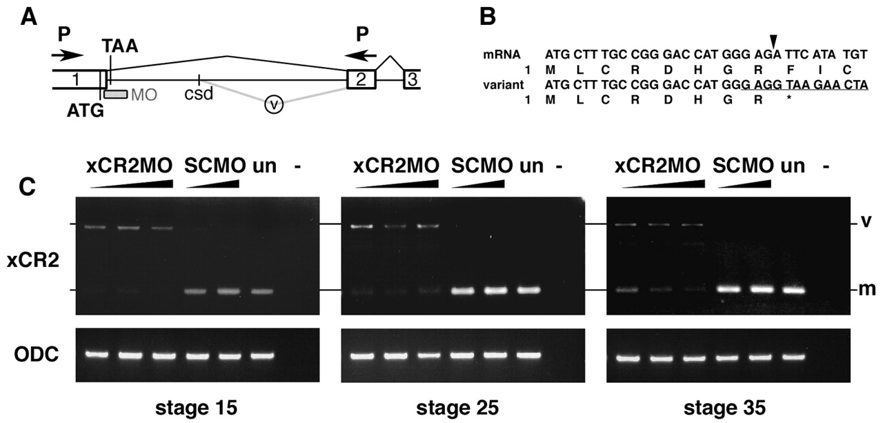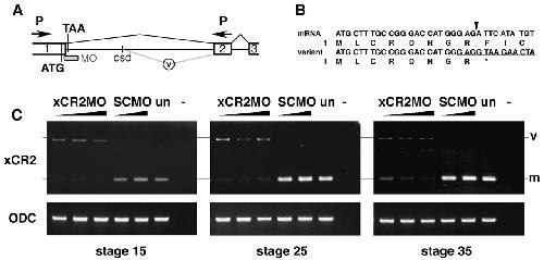 Fig. 4. XCR2 MO blocks endogenous RNA splicing. (A) Genomic structure including exon I (1), exon II (2), and exon III (3) of XCR2. The translation initiation codon (ATG) and a potential termination codon (TAA) are indicated. The splice-site-targeted antisense morpholino oligonucleotide XCR2 MO (MO) was designed against the sequence at the boundary of exon I/intron I. Abnormal splicing detected in XCR2 MO-injected embryos is shown by the gray line (v). The spliced variant is generated by a cryptic splice donor (csd) site 642 bp downstream from the end of exon I. (B) Sequence comparison of cDNA from mature mRNA and the aberrant splicing variant. Amino acid sequences are also indicated. The variant generated by abnormal splicing has a termination codon (correspondent to TAA in Fig. 4A) right after the end of exon I. Arrowhead indicates the correct exon I/exon II splice junction. The target sequence of XCR2 MO is underlined. (C) RT-PCR analyses of XCR2 mRNA in XCR2 MO-injected embryos. Embryos were injected with 10, 20 and 50 ng of XCR2 MO, or 20 and 50 ng of Standard Control MO (SC MO), and harvested for RT-PCR at stage 15, 25 and 35. The primer set was designed to span the first intron to detect splicing of the endogenous XCR2 pre-mRNA. In XCR2 MO-injected embryos, the mature mRNA (m) was decreased and an abnormal splicing variant (v) was detected. At stage 35, the mature XCR2 mRNA was detectable at low levels in embryos injected with lowest dose (10 ng) of XCR2 MO. |