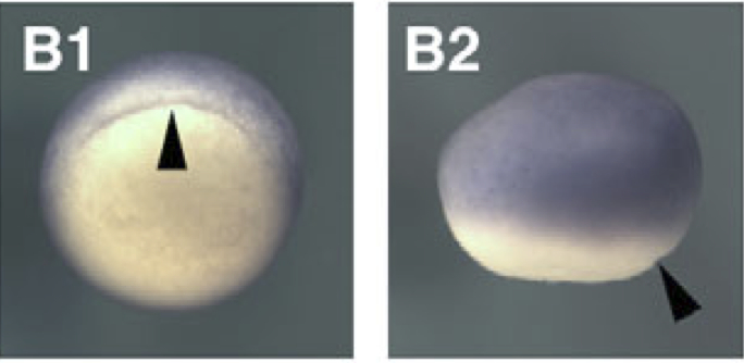 tdgf1.3 (teratocarcinoma-derived growth factor 1, member 3) gene expression in Xenopus laevis embryo, assayed via in situ hybridization, NF stage 10, blastoporal viw (B1 on left ) and lateral view, anterior right ( B2). |