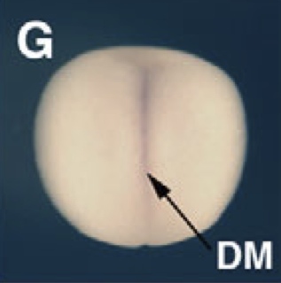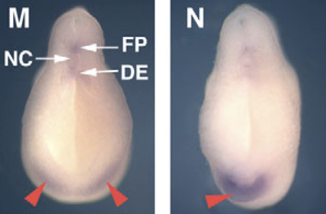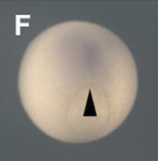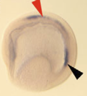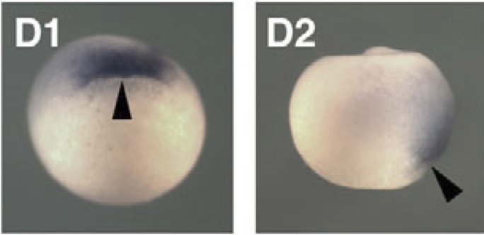 tdgf1.1 (teratocarcinoma-derived growth factor 1, member 1) gene expression in Xenopus laevis embryo, assayed via in situ hybridization, NF stage 12, blastoporal view, dorsal up (D1 left), and lateral view (D2 left). |