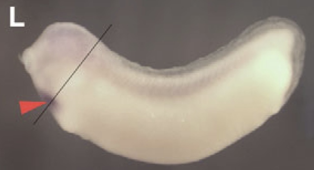 tdgf1.2 ( teratocarcinoma-derived growth factor 1, member 2 ) gene expression in Xenopus laevis embryo, assayed via in situ hybridization, NF stage 25, lateral view, anterior left, dorsal up. |