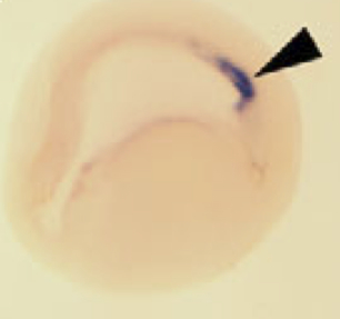 tdgf1.2 (teratocarcinoma-derived growth factor 1, member 2 ) gene expression in Xenopus laevis embryo, transverse section in trunk region, assayed via in situ hybridization, NF stage 20, dorsal up. |